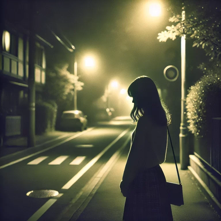 人気のない通り、冷たい風が木の葉を揺らし、遠くの街灯がぼんやりと光を落としている。